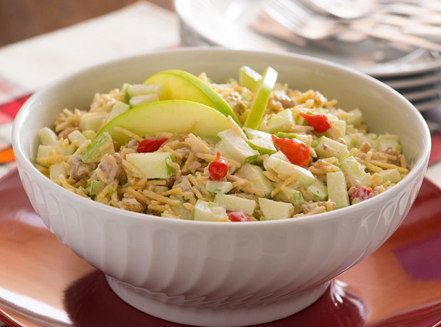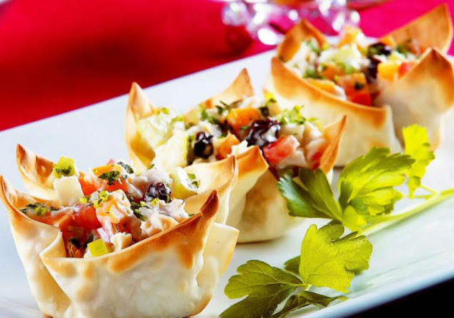 2. Em uma tigela, misture o peito de frango, a cenoura, o salsão, os pimentões coloridos, a azeitona verde, a uva passa e a maçã. Tempere com sal e a salsa. Envolva a maionese e recheie as cestinhas de massa de pastel. Sirva com salada de folhas verdes.