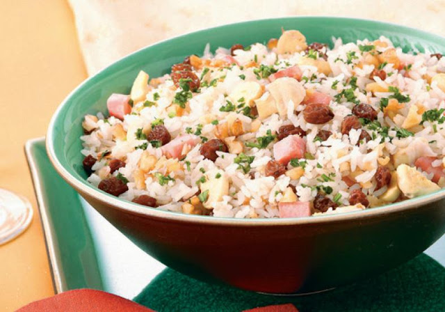 2. Ponha o presunto e a uva-passa e mexa mais um pouco. Derrame a água e o vinho. Espere ferver e deixe a panela semitampada até cozinhar. Se necessário, junte mais água. Quando estiver praticamente no ponto certo de cozimento, junte as nozes picadas.