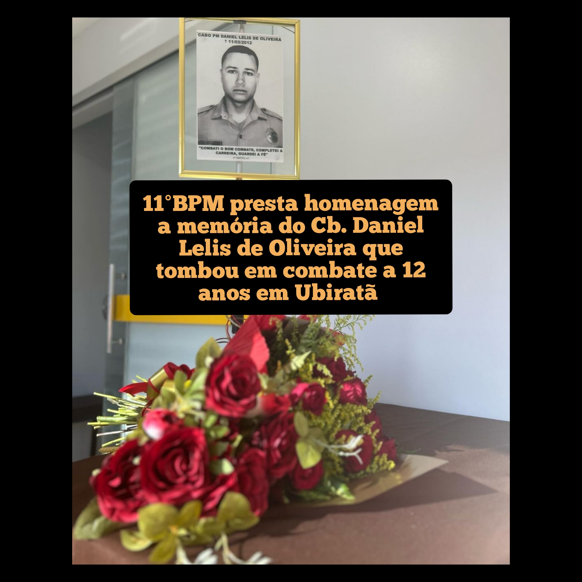 Morto durante combate com bandidos, há 12 anos, o Cabo Daniel Lelis de Oliveira, recebeu homenagem póstuma em sua memória nesta manhã de segunda-feira, na sede da 2ª Cia, em Ubiratã, por Policiais Militares do 11° BPM, com a presença da esposa e do filho de Daniel.