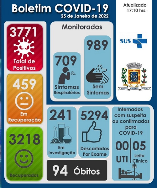 O boletim também informa que 1698 pessoas estão sendo monitoradas pelas equipes de saúde e devem permanecer em suas casas isoladas. 241 estão aguardando resultado de exames e podem estar com a doença. 05 pessoas que residem no nosso município estão internados.
