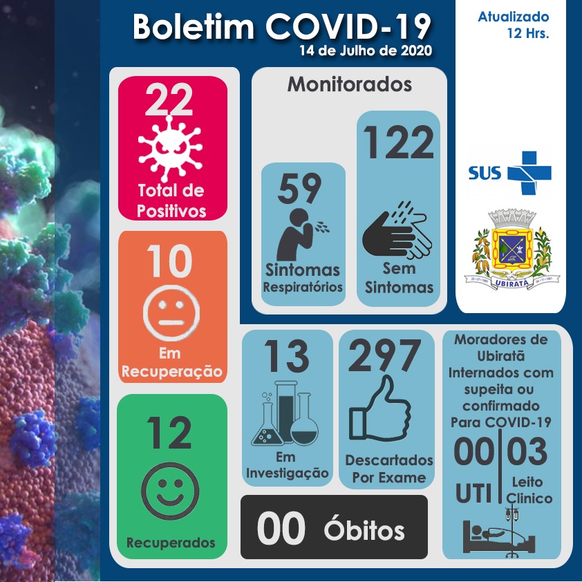A Secretaria de Saúde informa que nesta terça feira, tivemos mais 1 caso confirmado de COVID-19, totalizando 22 casos em Ubiratã até o momento, sendo que deste total , 10 estão se recuperando, e 12 já se recuperaram totalmente.