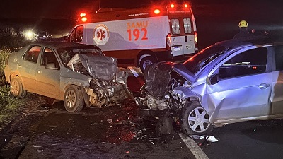 Uma colisão frontal envolvendo um veículo Gol e um Prisma foi registrado na noite desta terça-feira (14), no KM 507 da BR 369 no trecho entre as cidades de Corbélia e Cascavel.