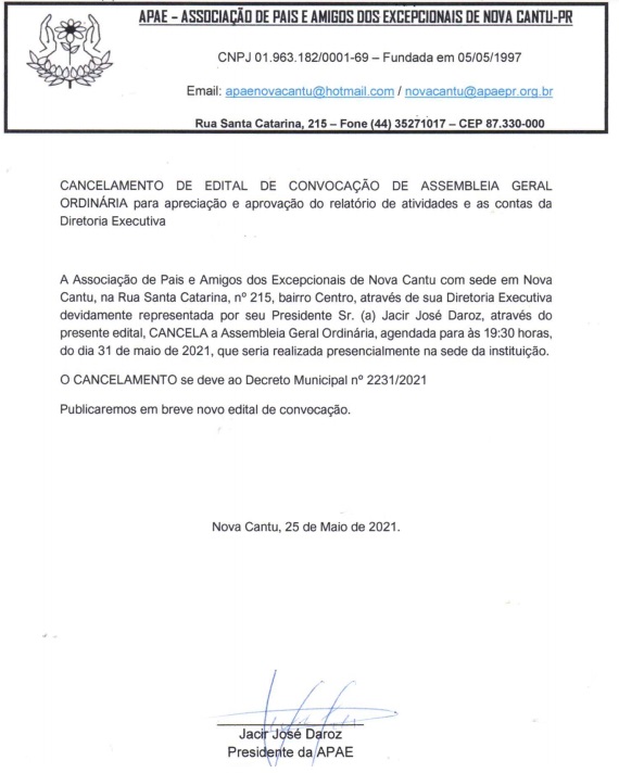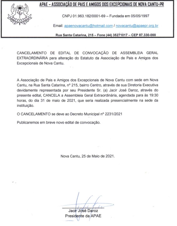 APAE DE NOVA CANTU: CANCELAMENTO DE EDITAL DE CONVOCAÇÃO PARA ASSEMBLEIA GERAL ORDINÁRIA E ASSEMBLEIA GERAL EXTRAORDINÁRIA PARA ALTERAÇÃO DO ESTATUTO