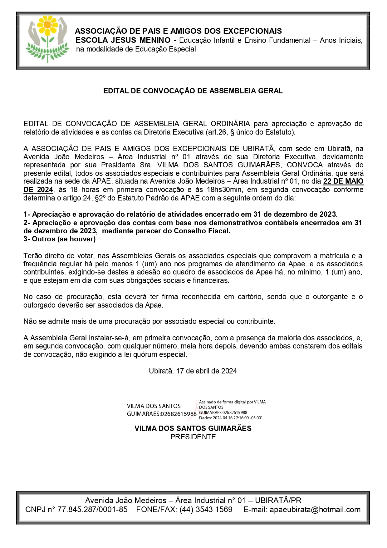 2. APAE DE UBIRATÃ: Edital de Convocação de Assembleia Geral