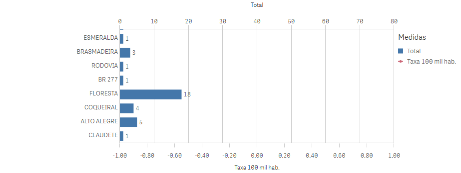 A distribuição dos casos revela concentração importante em áreas específicas da cidade, com destaque absoluto para o bairro Floresta, que acumula 18 ocorrências — número muito acima dos demais e que o coloca como principal ponto crítico no município.