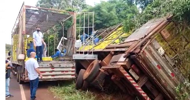 Um caminhão de carga com frango vivo acabou tombando as margens da rodovia PR 180 entre Cafelândia e Nova Aurora na manhã desta quarta-feira (17).