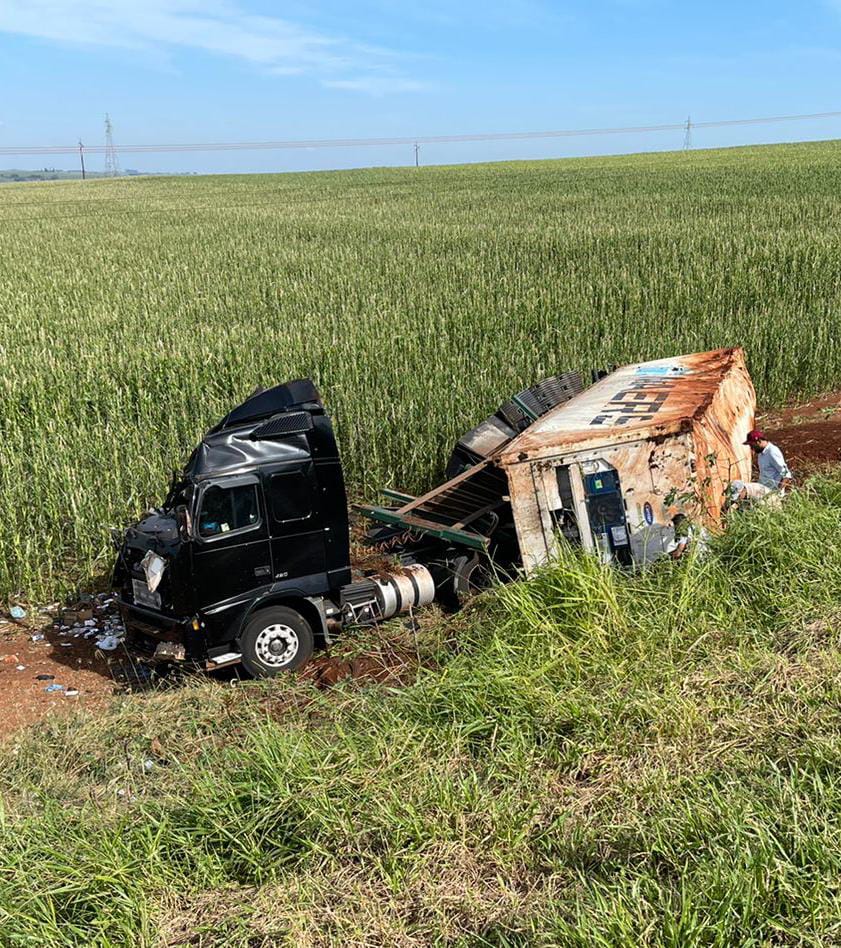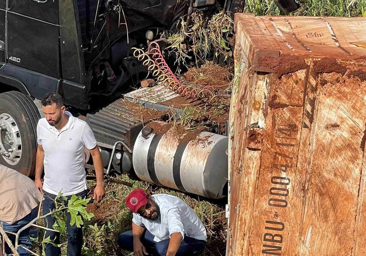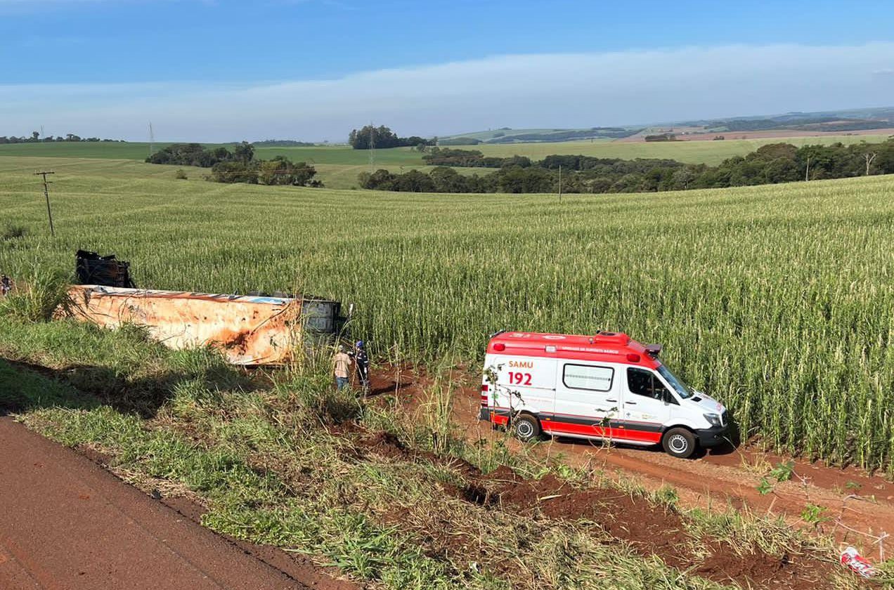 Equipes do SAMU e Corpo de Bombeiros foram acionadas para atendimento ao motorista do caminhão que sofreu ferimentos graves.