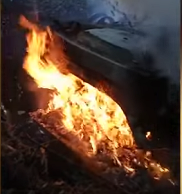 O carro acidentado ficou com as quatro rodas pra cima sendo consumido completamente pelas chamas. Um caminhão-pipa foi usado para controlar o fogo.