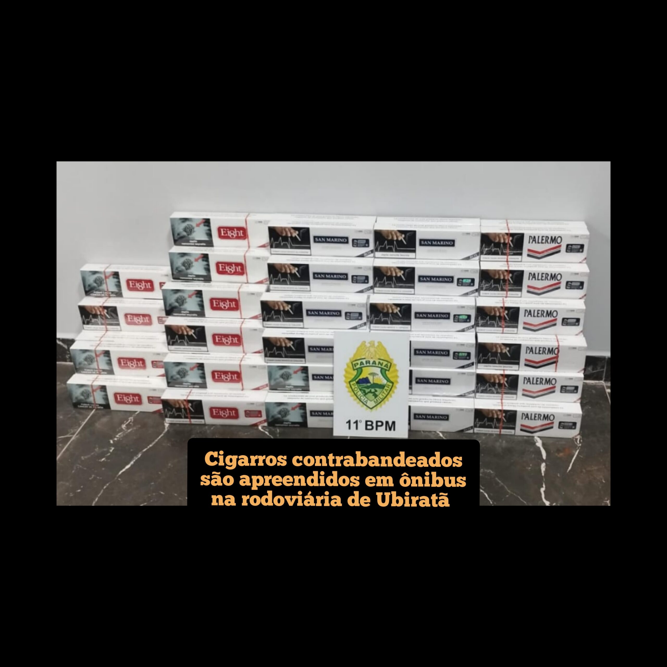 A equipe policial de R.P.A. em abordagem a um ônibus na rodoviária do município de Ubiratã, com intuito de inibir a pratica de contrabando de mercadorias e trafico de drogas, verificou durante a revista das bagagens, dois volumes com mercadorias oriundas do Paraguai (cigarros ).