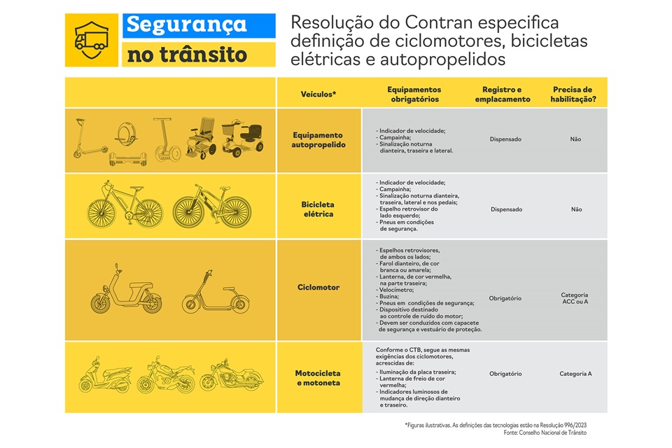 O Conselho Nacional de Trânsito (Contran), por meio da Resolução nº 996/2023, atualizou a classificação de ciclomotores, bicicletas elétricas e equipamentos de mobilidade individual autopropelidos, como patinetes e skates. O texto entrou em vigor no dia 1° de julho de 2023 e prevê o prazo entre 1° de novembro de 2023 e 31 de dezembro de 2025 para a regularização por parte dos proprietários de ciclomotores. Os condutores de bicicletas, mesmo elétricas, skates e patinetes não necessitam de qualquer tipo de documentação.