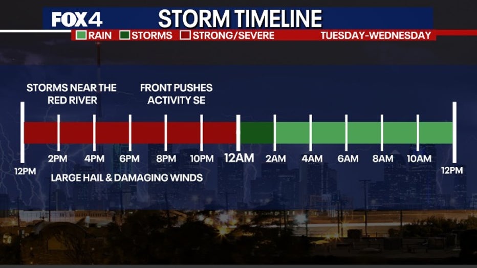 According to the FOX 4 Weather team, the timeline has not changed. People should stay weather aware beginning in the early afternoon as storms redevelop to the north and then around the rush hour for the Metroplex.