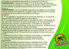 enfrentamento da pandemia decorrente do coronavírus (COVID-19), e epidemia de dengue. As disposições aqui tratadas são complementares aos instrumentos já publicados a respeito das medidas adotadas para combate e prevenção ao COVID-19, principalmente em relação ao Plano de Contingenciamento Covid-19 — novo coronavírus, disponível no sitio oficial do município http://ubirata.prgov.br.
