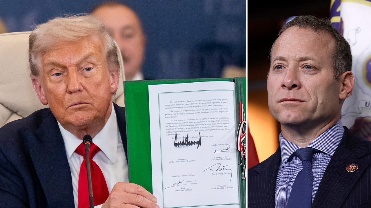 President Donald Trump delivers remarks on the Gaza war during the Gaza summit chaired by Egyptian President Abdel Fattah al-Sisi in Sharm el-Sheikh, Egypt, on Oct. 13, 2025, left; and Rep. Josh Gottheimer, D-N.J., listens during a press conference on legislation supporting Holocaust education nationwide at the U.S. Capitol Building in Washington, D.C., on Jan. 27, 2023, right. (Michael Kappeler/picture alliance via Getty Images (left); Anna Moneymaker/Getty Images (right))