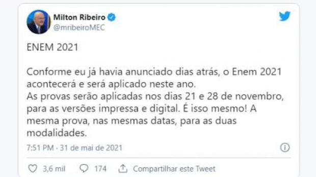 “Conforme eu já havia anunciado dias atrás, o Enem 2021 acontecerá e será aplicado neste ano. As provas serão aplicadas nos dias 21 e 28 de novembro, para as versões impressa e digital. É isso mesmo! A mesma prova, nas mesmas datas, para as duas modalidades”, postou o ministro na rede social.