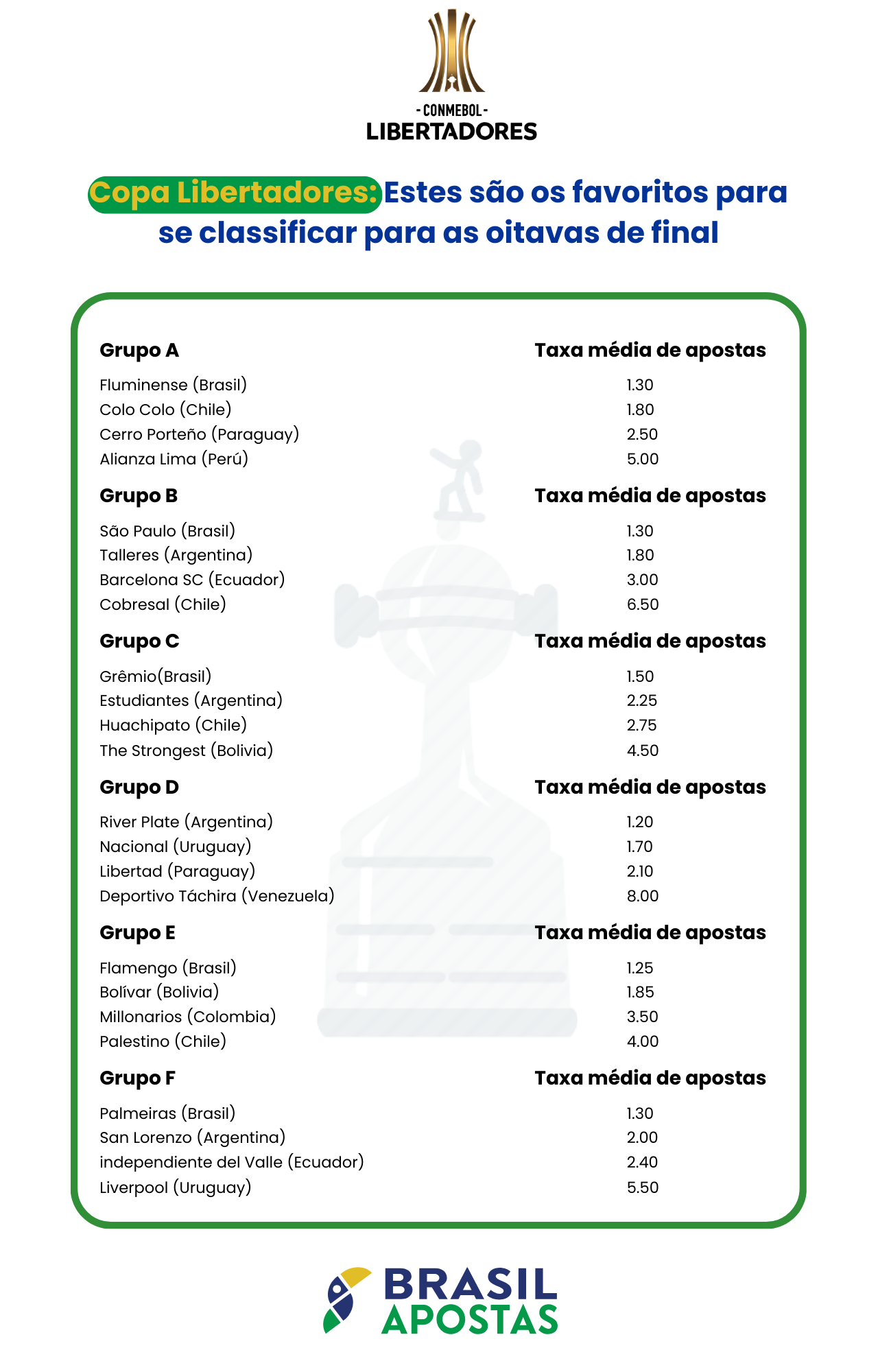Fluminense, São Paulo, Grêmio, Flamengo e Palmeiras são os favoritos para avançar aos oitavos de final da Copa Libertadores, segundo estudo de BrasilApostas. As cotações médias das principais casas de apostas refletem a força dos times brasileiros, destacando sua consistência e qualidade nas performances até agora.