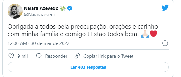 “A todos que estão me mandando mensagem, eu quero agradecer o carinho, o respeito, a preocupação, as orações. Respondendo de forma geral, a minha família está bem. É uma situação chata, que entristece a gente. Mas tem que ser grato a Deus porque não aconteceu nada com a integridade física deles. É só Deus pra cuidar do coraçãozinho agora. O importante é que tá todo mundo bem”, afirmou a artista nos Stories do Instagram. Veja: