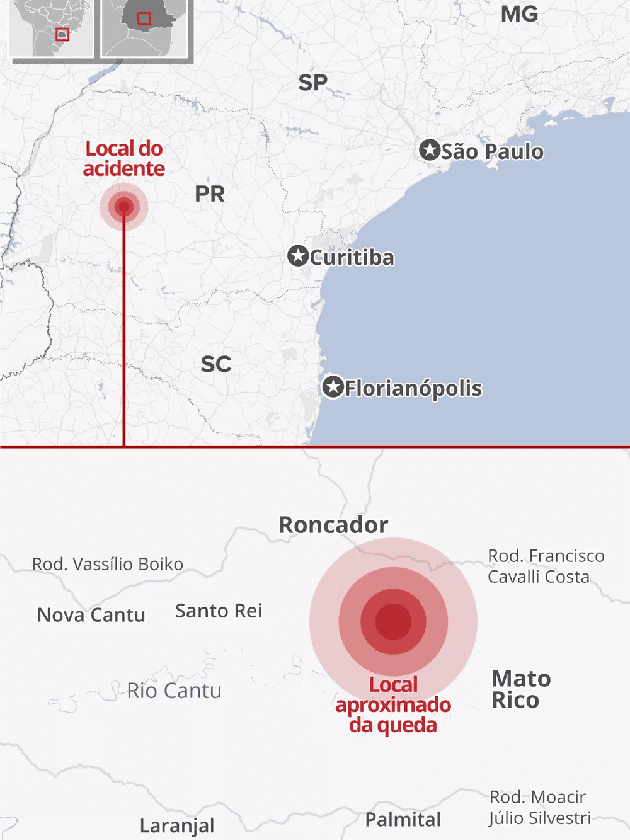 No entanto, cerca de uma hora depois da decolagem no aeroporto em Goioerê, o monomotor caiu dentro de um rio em Mato Rico, na região central do estado.