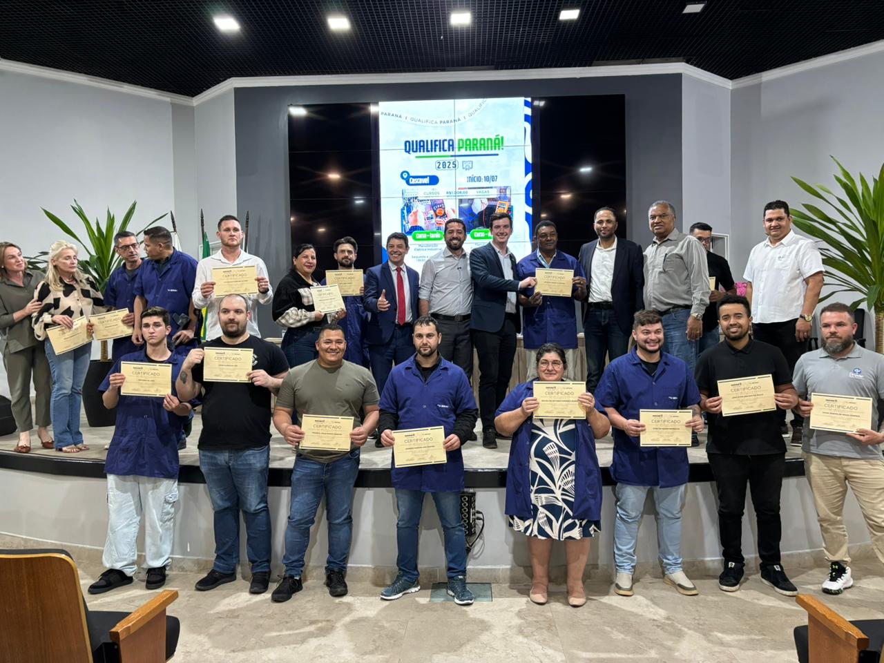 A Prefeitura de Cascavel, em parceria com o Governo do Estado do Paraná, realizou, ontem (02), a cerimônia de formatura do curso de Instalações Elétricas Industriais, ofertado pelo Projeto Qualifica Paraná 2025. A solenidade aconteceu no auditório do Paço Municipal e reuniu familiares e autoridades municipais e estaduais para celebrar a conquista de 28 formandos.