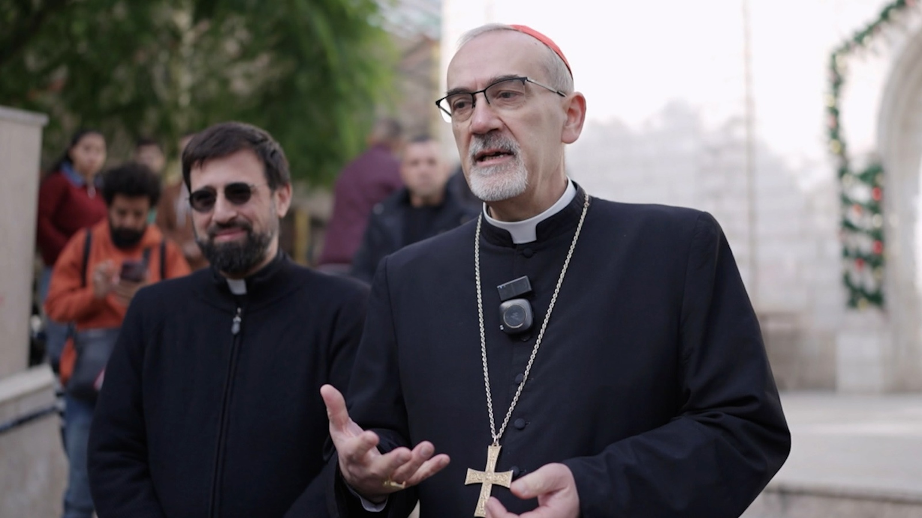 Cardinal Pierbattista Pizzaballa speaks outside the Holy Family Church in Gaza, Dec. 21, 2025.