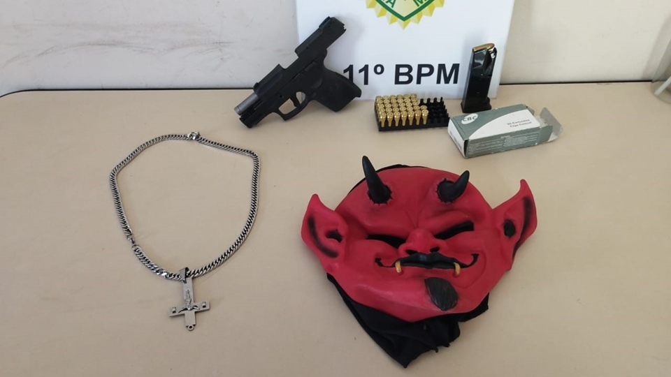 Sobre máscara do “demônio” que estava colocada no encosto do banco do passageiro, ele alegou ser de religião satanista e que a máscara era seu amuleto. A PM deu voz de prisão e encaminhou o individuo para as providências de Polícia Judiciária.