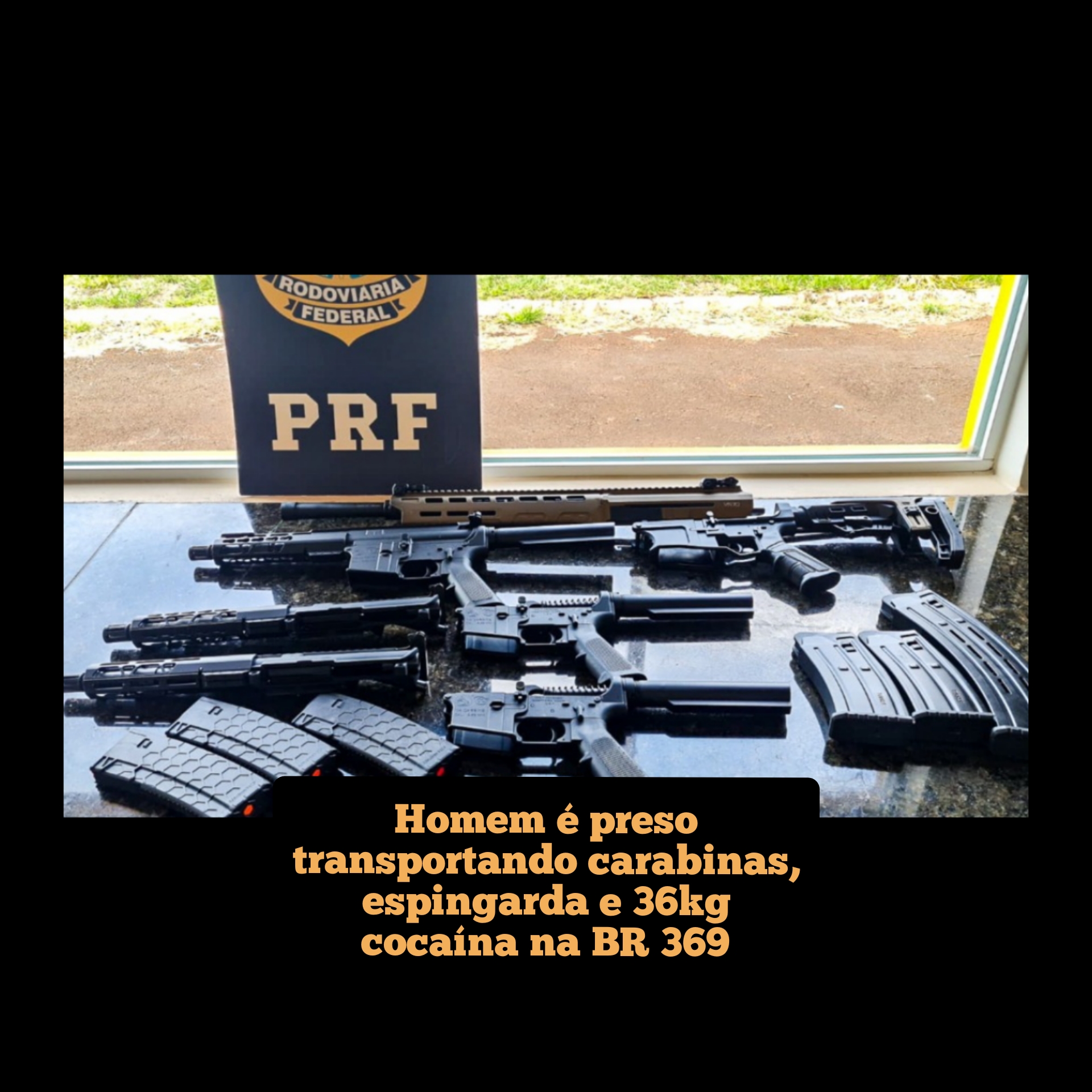 A Polícia Rodoviária Federal (PRF) prendeu um homem transportando três carabinas, uma espingarda e 36 quilos de cocaína. O material foi descoberto após o homem demonstrar intenso nervosismo e fornecer informações conflitantes e desconexas em abordagem realizada na BR 369.