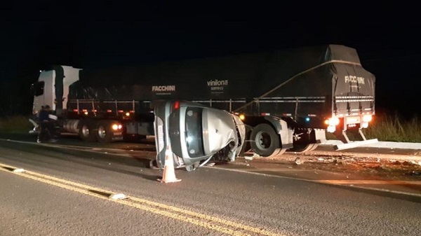 Com o impacto o carro tombou, foi arrastado por cerca de 50 metros e parou com a lateral para baixo sobre a pista.