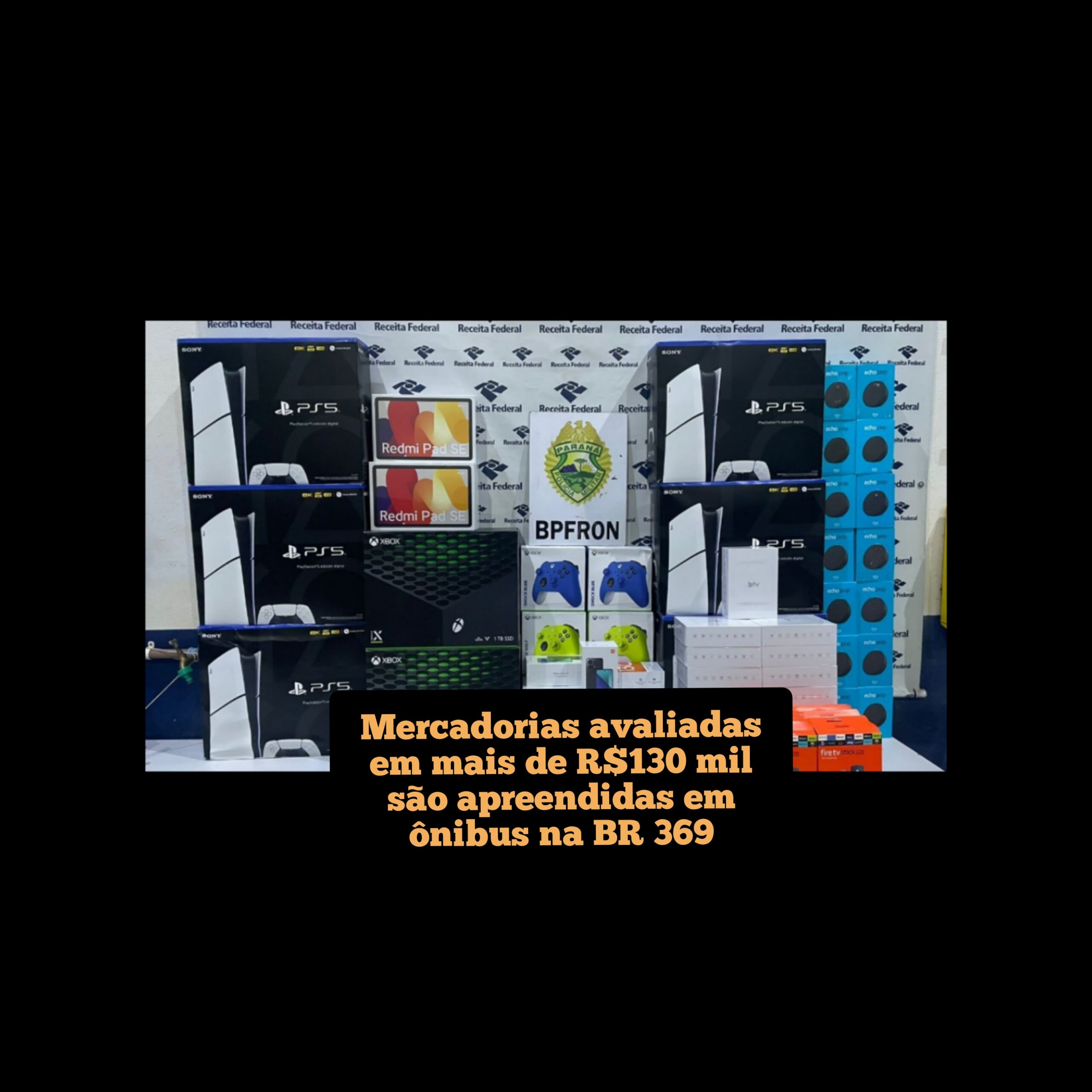 No bagageiro do ônibus de linha interestadual com destino a São Paulo-SP foram localizadas diversas mercadorias de origem estrangeira sem os devidos trâmites aduaneiros. Entre elas estavam celulares, drones, tvs box, Ipads entre outros.