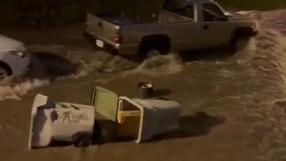 Street flooding on North Pulaski Street led to trash bins being swept away in the current on Wednesday, April 15, 2026.