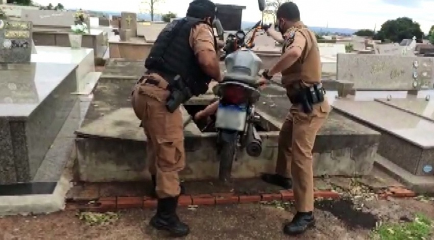 Uma motocicleta foi encontrada escondida dentro de um túmulo no cemitério de Cornélio Procópio, no norte pioneiro do Paraná. Segundo a Polícia Militar (PM), uma equipe foi ao local e retirou o veículo, na quinta-feira (11).