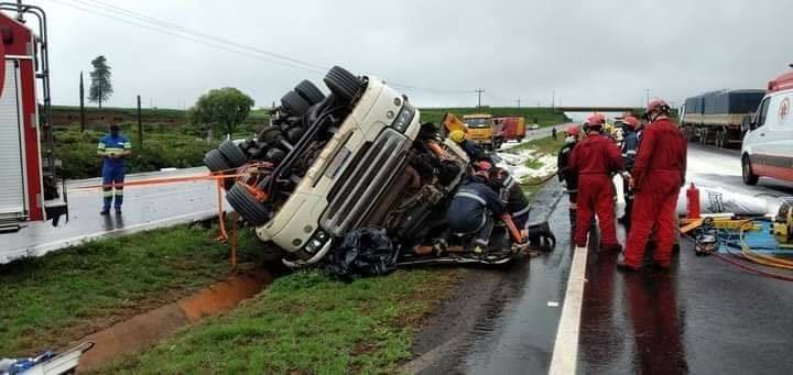 Um grave acidente foi registrado na manhã desta terça-feira (15), por volta das 07:50 da manhã , no anel viário de Campo Mourão, na rodovia PR-158, deixou o condutor de uma carreta carregada com uma carga de arroz preso às ferragens.