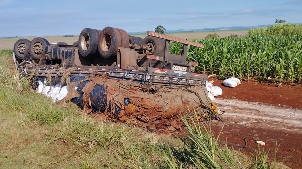 O caminhão seguia sentido Engenheiro Beltrão a Campo Mourão e tombou em um trecho de reta, parando fora da pista com os pneus para cima, em uma estrada paralela com a rodovia.