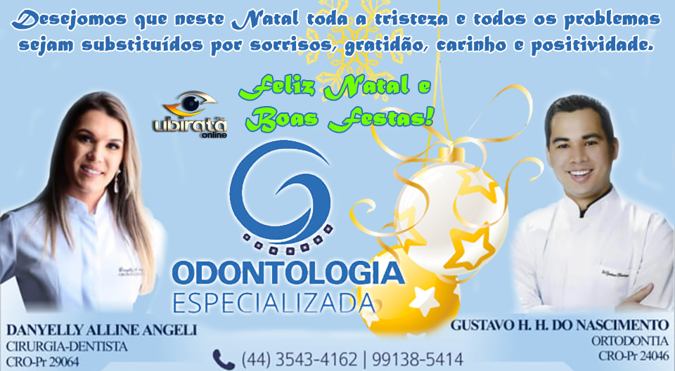 Mensagem da ODONTOLOGIA ESPECIALIZADA – Serviço de odontologia com a praticidade e qualidade que você precisa. Dra. Danyelly Alline Angeli e Dr. Gustavo H. H. do Nascimento – Rua Brasilia 747. Tel. (44) 3543 4162 / (44) 9 9138 5414 a todos os clientes e amigos.
