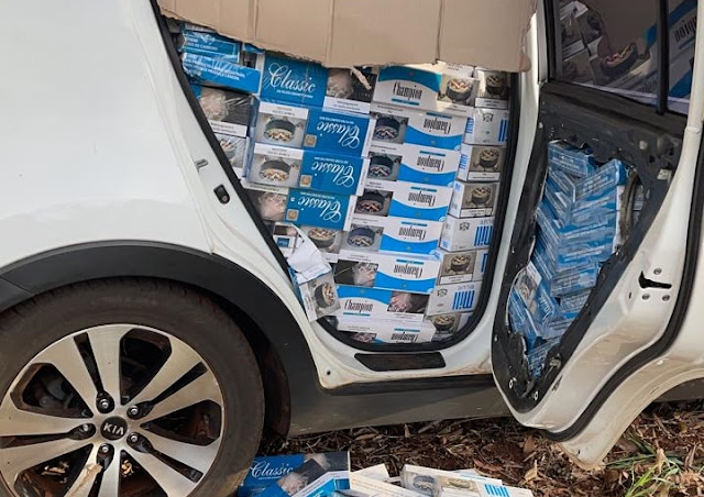 O condutor do veiculo Astra foi abordado na mesma estrada rural que o condutor do Kia abandonou o veiculo. Dentro do veiculo Kia foi encontrado varias caixas de cigarro oriundas do Paraguai e ao verificar com mais cuidado foi constatado que o veiculo estava com placas frias, sendo que as placas que estavam no veiculo eram de outro veículo.