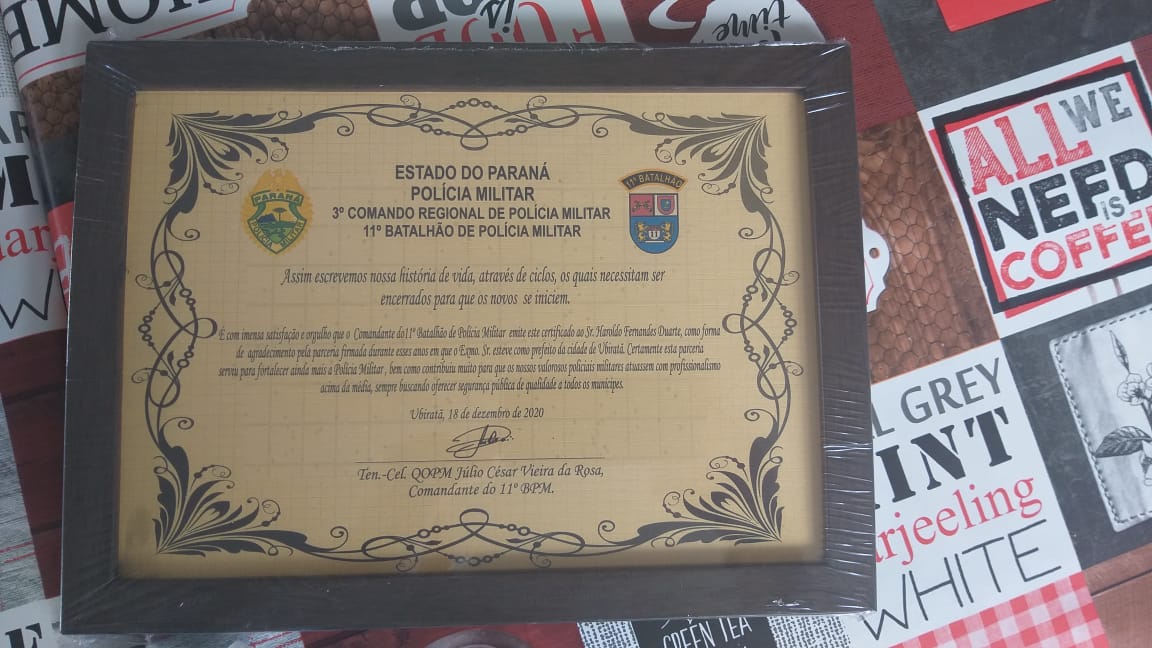 “É COM IMENSA SATISFAÇÃO E ORGULHO QUE O COMANDANTE DO 11º BATALHÃO DE POLÍCIA MILITAR EMITE ESTE CERTIFICADO AO SR. HAROLDO FERNANDES DUARTE, COMO FORMA DE AGRADECIMENTO PELA PARCERIA FIRMADA DURANTE ESSES ANOS QUE O EXMO. SR. ESTEVE COMO PREFEITO DA CIDADE DE UBIRATÃ. CERTAMENTE ESTA PARCERIA SERVIU PARA FORTALECER AINDA MAIS A POLÍCIA MILITAR, BEM COMO CONTRIBUIU PARA QUE NOSSOS VALOROSOS POLICIAIS MILITARES ATUASSEM COM PROFISSIONALISMO ACIMA DA MÉDIA, SEMPRE BUSCANDO OFERECER SEGURANÇA PÚBLICA DE QUALIDADE PARA TODOS OS MUNÍCIPES”.