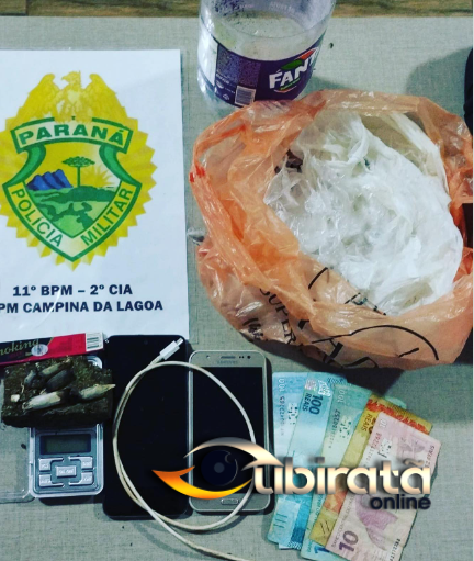 Ao realizar a busca pessoal não foi encontrado nenhum ilícito. Foram realizadas buscas no terreno onde o homem se evadiu e localizado de imediato roupas e calçados que batiam com os mesmos que foram vistos pelas câmeras de segurança no local do furto do veiculo, foi localizado também um estojo contendo pertences da vítima que reconheceu como sendo pertences deixados no veículo, já no interior da residência foi localizado um total de 77,4 grama(s) da canabis (maconha), dois celulares, um total de R$ 330,00 em espécie, e embalagens para maconha em uma sacola, todas picadas.