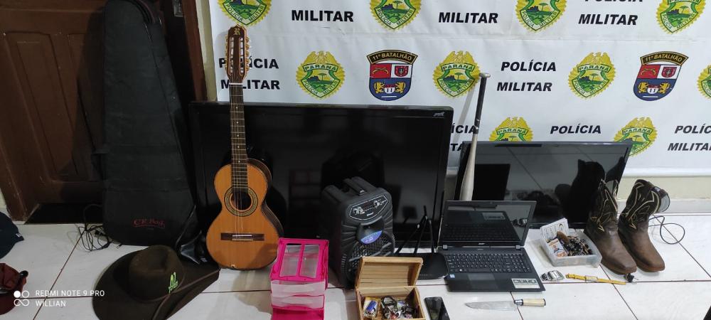 Foram recuperados os seguintes objetos: 01 TV 42 POLEGADAS SEMP TOSHIBA; 01 TV 32 POLEGADAS PANASONIC; 01 NOTEBOOK 14 POLEGADAS; JOIAS DIVERSAS; RELOGIOS; VIOLA; BOLSA/MOCHILA; UM PAR DE BOTAS; ROUPAS DIVERSAS; CRACHA; CHAPÉU; 01 TACO DE BAISEBOL; 01 CAIXA DE SOM LENOX 150 WATS; 01 FACA; 01 CELULAR SAMSUNG; 01 ROTEADOR TPLINK.