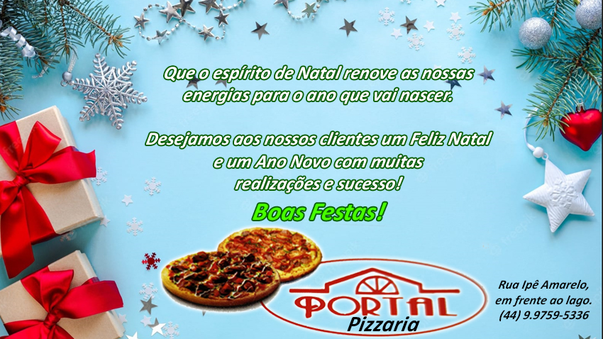 Mensagem da PORTAL PIZZARIA. A melhor e mais deliciosa pizza da cidade. Rua Ipê Amarelo, Parque dos Ipês (em Frente ao Lago) Tel. (44) 9 9759 5336 a todos seus clientes e amigos.