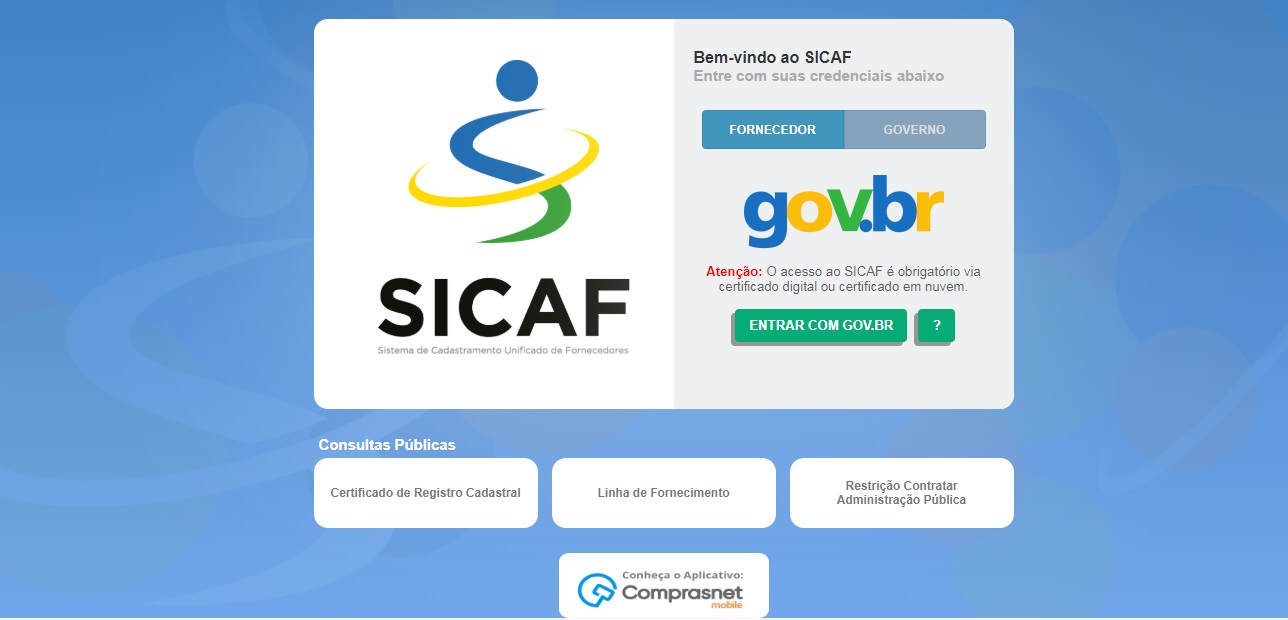 O Município de Ubiratã aderiu à plataforma Compras Governamentais, do Governo Federal, para realização dos pregões eletrônicos. É uma plataforma totalmente gratuita, que possui como requisito principal o cadastramento dos potenciais licitantes no Sistema de Cadastramento Unificado de Fornecedores – SICAF para conseguirem utilizar o sistema.