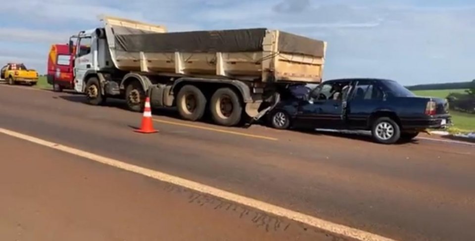 Informações são de que um caminhão que transportava brita para manutenção da pista parou em barreira realizada na rodovia, sentido à Corbélia, quando o automóvel Monza não conseguiu frear a tempo de evitar a batida traseira.
