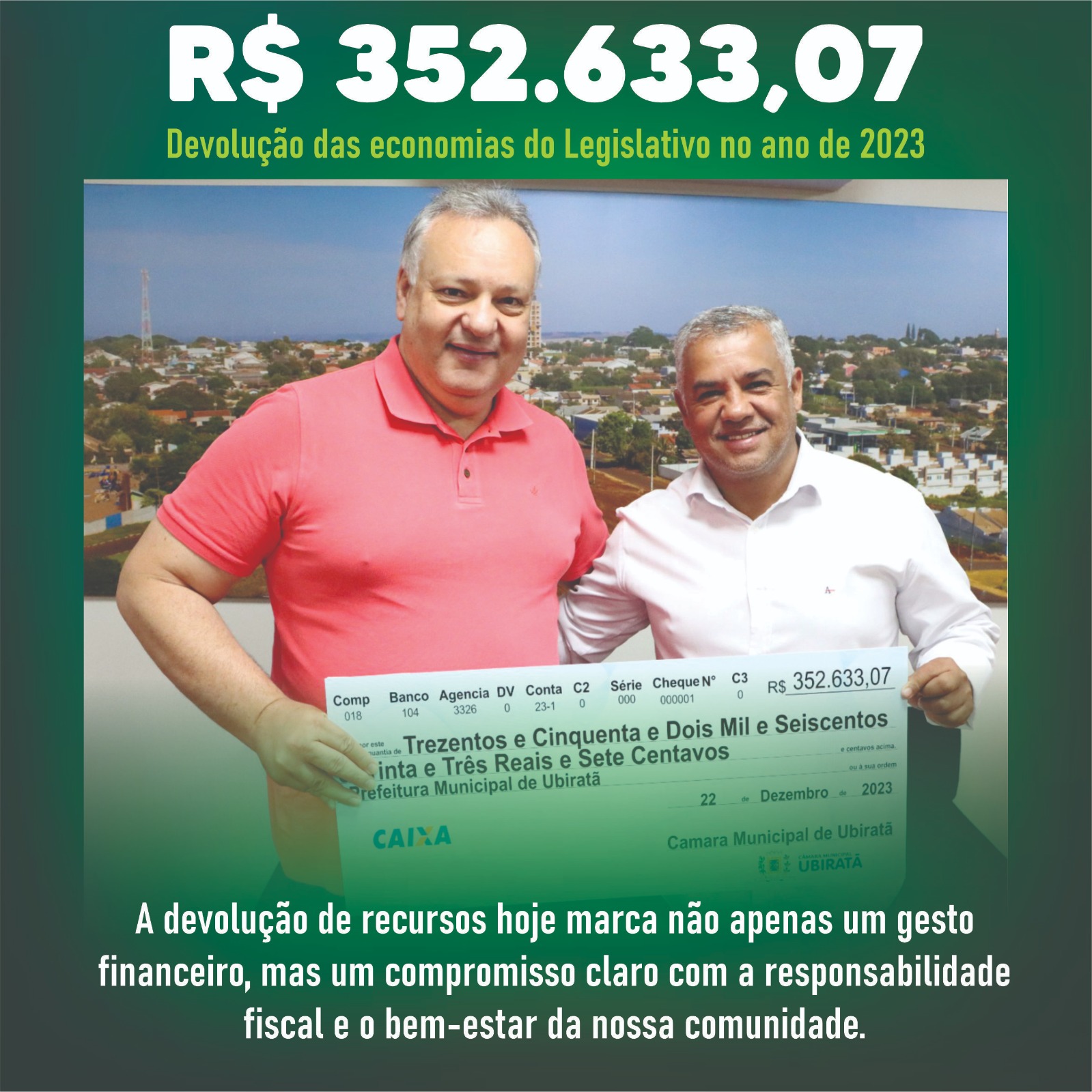 Na manhã de hoje, (22), a Câmara de Vereadores de Ubiratã entregou um cheque simbólico no valor de R$ 352.633,07 ao prefeito Fábio Dalécio. Essa devolução representa a economia feita pelo Legislativo em relação aos recursos recebidos durante o exercício de 2023.