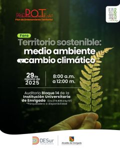 El viernes 29 de agosto, de 8:00 a. m. a 1:00 p. m., en el bloque 14 de la Institución Universitaria de Envigado (IUE) se realizará el Foro “Territorio sostenible: medio ambiente y cambio climático”. Se trata de un espacio de encuentro y análisis en el que expertos, líderes comunitarios y ciudadanos; compartirán experiencias, retos y oportunidades para enfrentar el cambio climático, con una visión integrada del territorio y su ordenamiento.