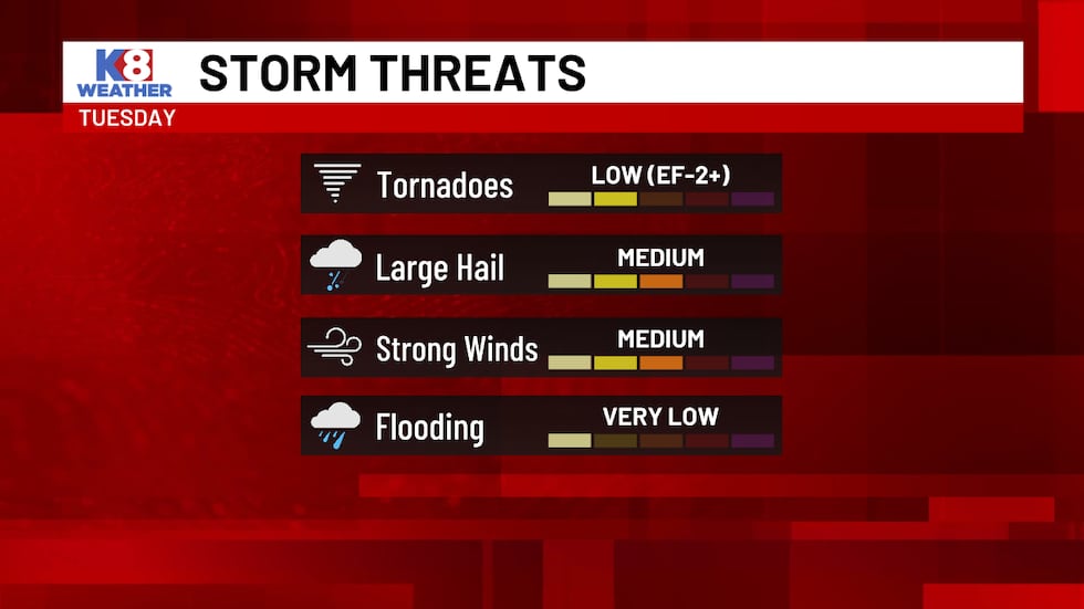 Our main threats are large hail and strong winds. There’s a low threat for tornadoes and a very low threat for flooding in places that see locally heavy rain.