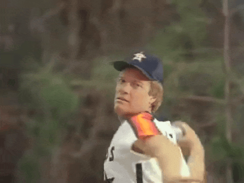 At first I was thrown off by the “M. SCOTT” on his jersey, since the Astros had only one player named Scott at the time. (They did have Tony Scott in 1984, so maybe Mike wore an old jersey for the shoot.) But I was really not prepared for Mike’s pitch to explode upon impact with the trash can.