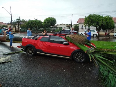 Uma condutora de um veículo Saveiro passou por um grande susto na tarde de hoje em Assis Chateaubriand, no momento em que ela estava transitando com o veículo na Avenida dos Pioneiros, um coqueiro veio a cair em cima do veículo.