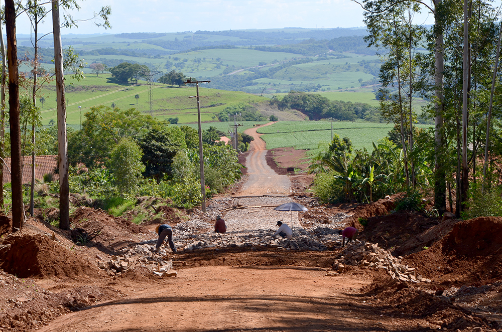 São R$ 849.339,26 de investimentos em pavimentação com pedras poliédricas (irregulares) somente em determinados trechos de declive, ou seja, em vez de fazer a estrada toda, pavimenta-se apenas os pontos críticos – subidas/descidas.