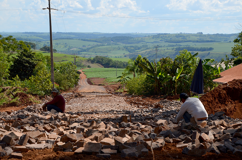 São R$ 849.339,26 de investimentos em pavimentação com pedras poliédricas (irregulares) somente em determinados trechos de declive, ou seja, em vez de fazer a estrada toda, pavimenta-se apenas os pontos críticos – subidas/descidas.