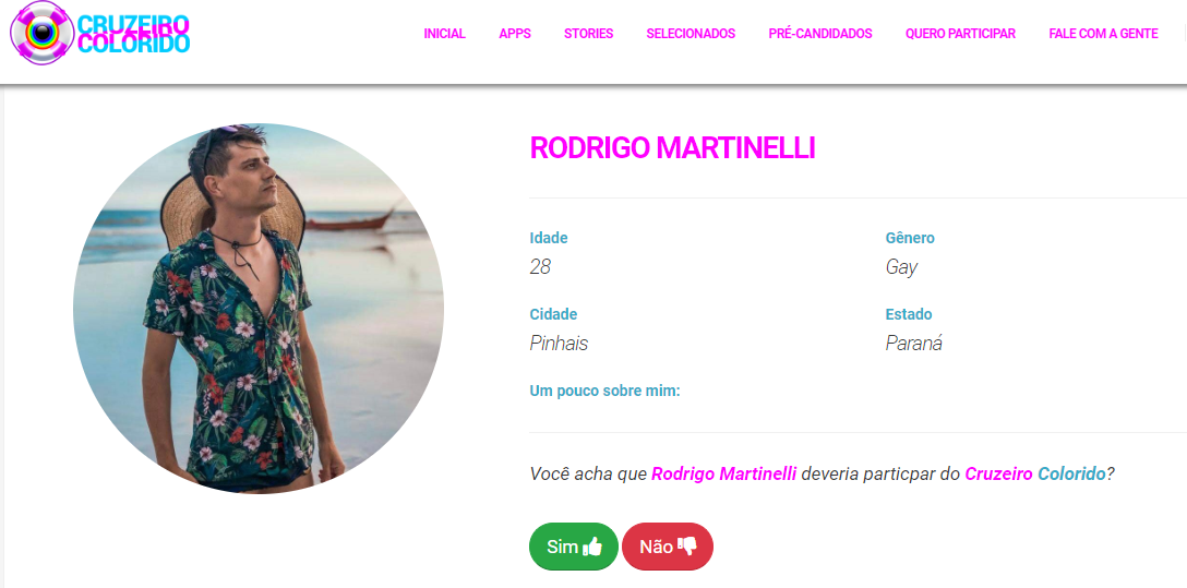 Foi então que com cerca de dois a três dias, chegou a notícia de que eu havia sido pré-selecionado, e na hora quase não acreditei! Mas para conseguir de fato entrar e participar do reality, preciso dos votos do público, e conto com a ajuda de todos.