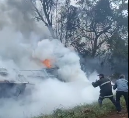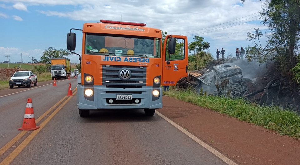 Equipes do Corpo de Bombeiros e Defesa Civil foram até o local para apagar as chamas e interditar a via.