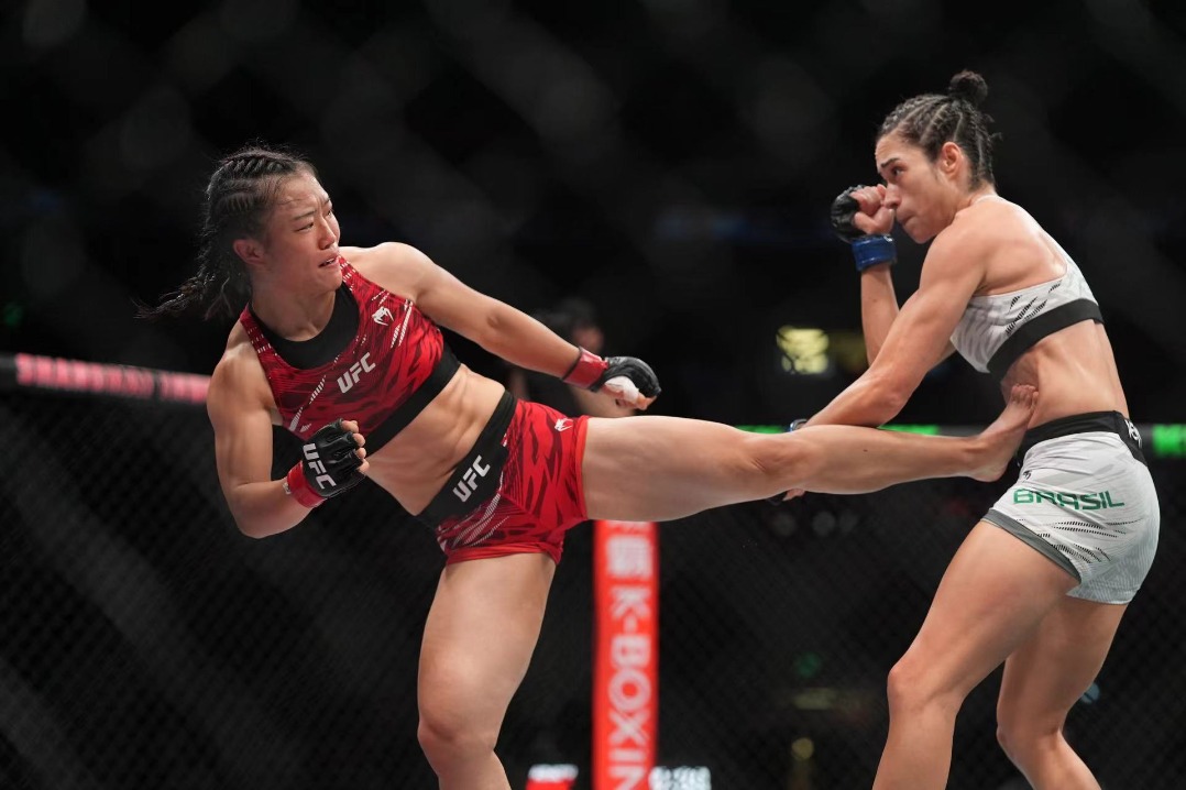 China”s rising MMA fighter Shi Ming (left) in competition during a strawweight bout against Brazil’s Bruna Brasil in the main event of the Road to UFC Season 4 semifinals on Friday at the Shanghai Indoor Stadium. [GAO ERQIANG / CHINA DAILY]