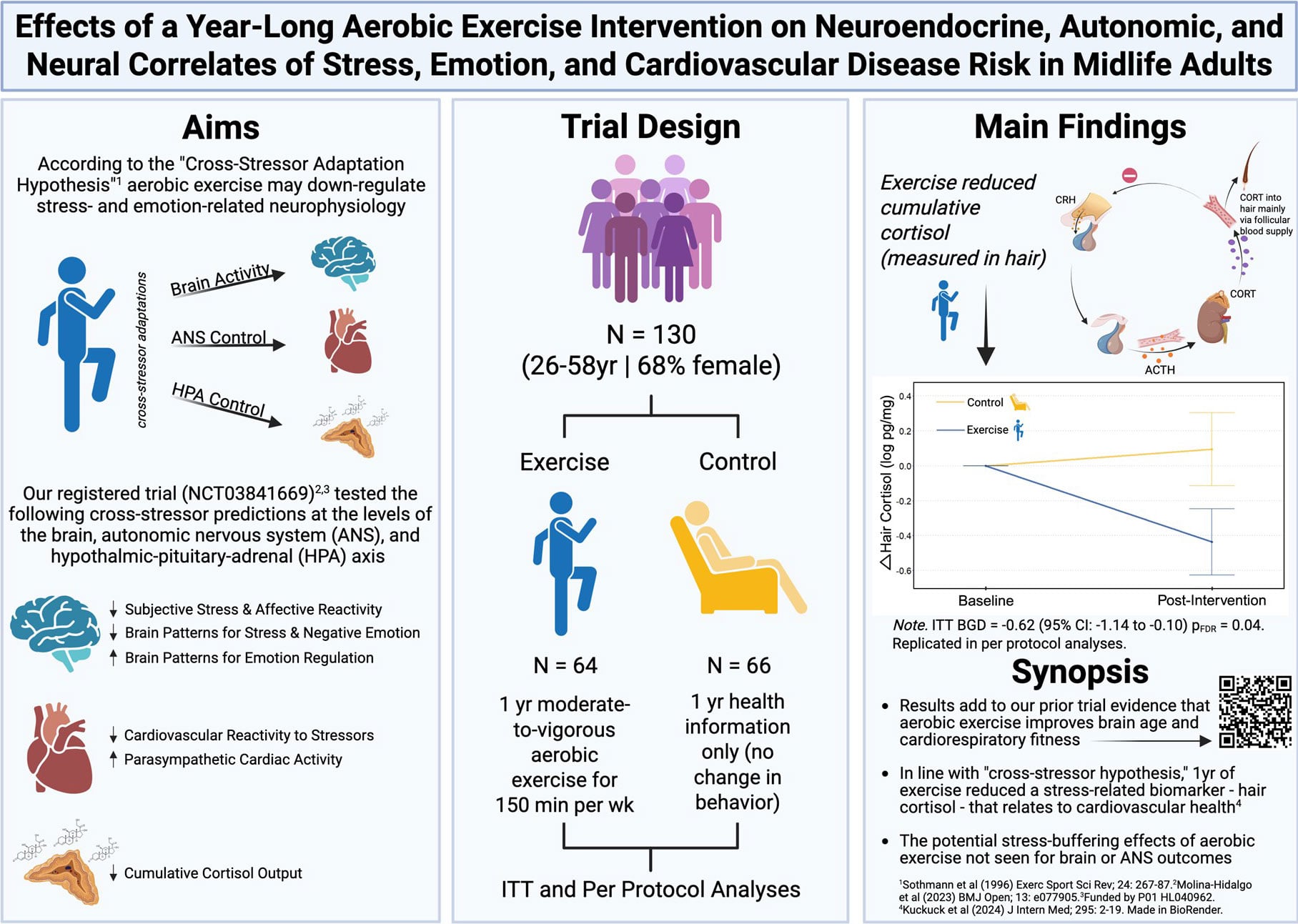 Reference: “Effects of a year-long aerobic exercise intervention on neuroendocrine, autonomic, and neural correlates of stress, emotion, and cardiovascular disease risk in midlife adults” by Peter J. Gianaros, Lu Wan, Mia K. DeCataldo, Cristina Molina Hidalgo, Mark R. Scudder, George Grove, Abigail Shell, Chae Ryon Kang, E. Lydia Wu-Chung, Anna L. Marsland, Thomas W. Kamarck, Javier Rasero and Kirk I. Erickson, 17 March 2026, Journal of Sport and Health Science.